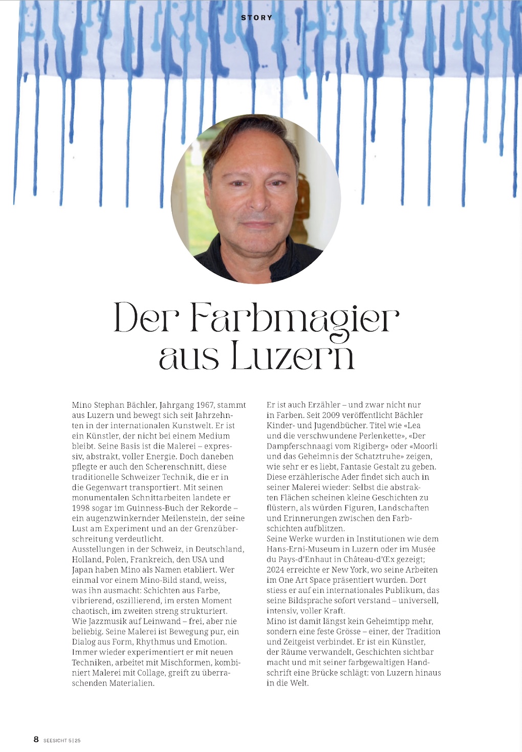 MINO Stefan Bächler (*1967) erkundet in seiner künstlerischen Arbeit verschiedene Ausdrucksformen. 1998 kam er mit seiner Scherenschnittkunst ins Guiness-Buch der Rekorde. Zudem gestaltete er mehrere sehr erfolgreiche Kinderbücher. Seine Gemälde stellt er in der Schweiz, Deutschland, Frankreich, Holland und Polen aus. MINO will mit seiner Kunst «die Schönheit einzelner Szenen» einfangen.