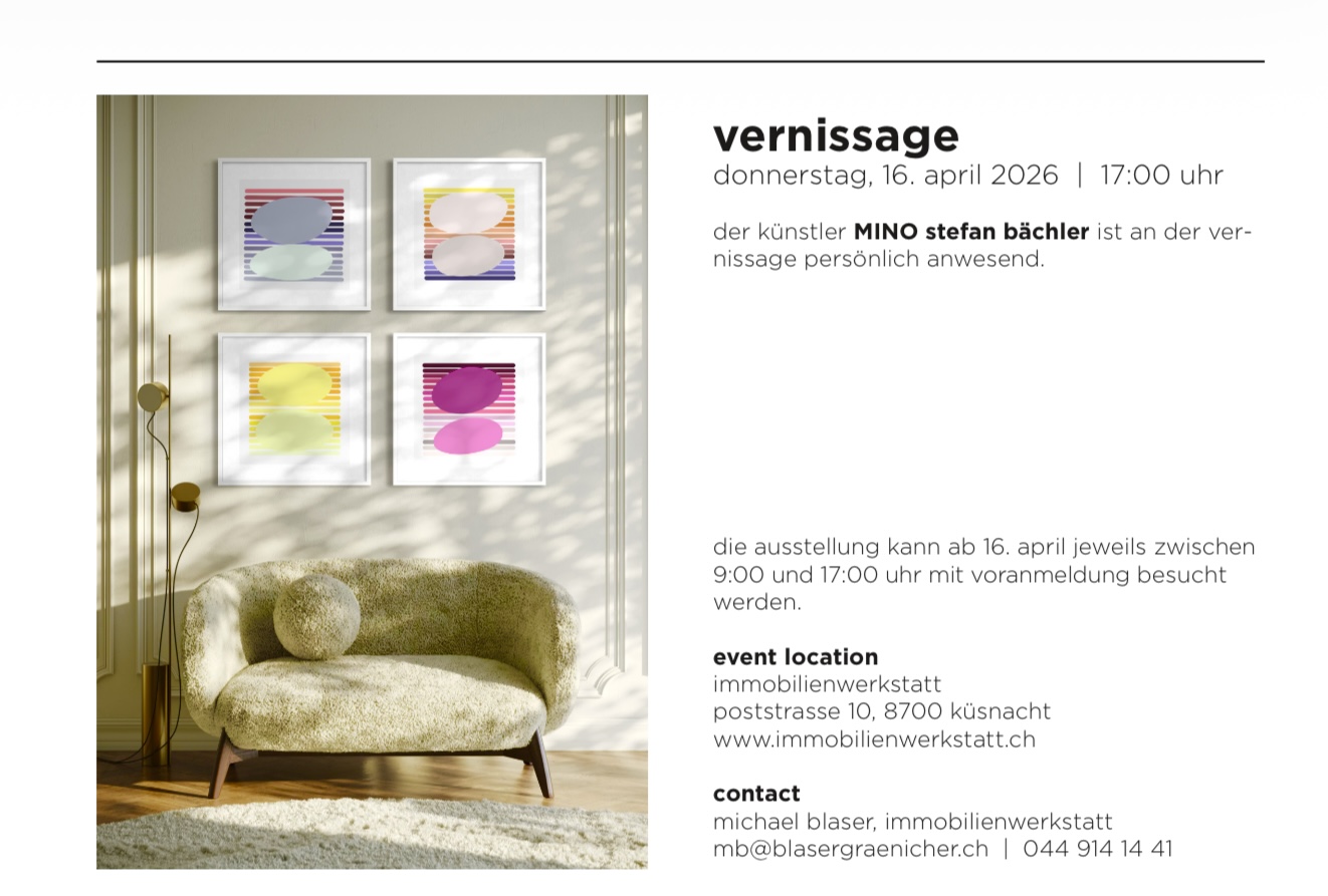 Unter dem Motto „TYPISCH ZÜRICH“ zeigt der Künstler MINO Stefan Bächler neue Ölbilder, monochron und holzschnittartig gemalt. So bekannt die dargestellten Orte und Szenen auch sind (Streetparade und Sechseläuten, Paradeplatz und Kanzlei-Flohmarkt), so überraschend neu zeigen sie sich im Blick von MINO. Einzigartig ist auch die Technik, die der Künstler gewählt hat, um die Essenz der Stadt festzuhalten. Mit schwarzer Ölfarbe auf weisser Leinwand stellt er die ausgewählten Ansichten der Grossstadt monochrom dar. Dennoch wirken die Bilder alles andere als starr, das pulsierende Leben ist im Flow; die einzelnen Szenen lösen sich fast auf in der Gleichzeitigkeit des Geschehens.